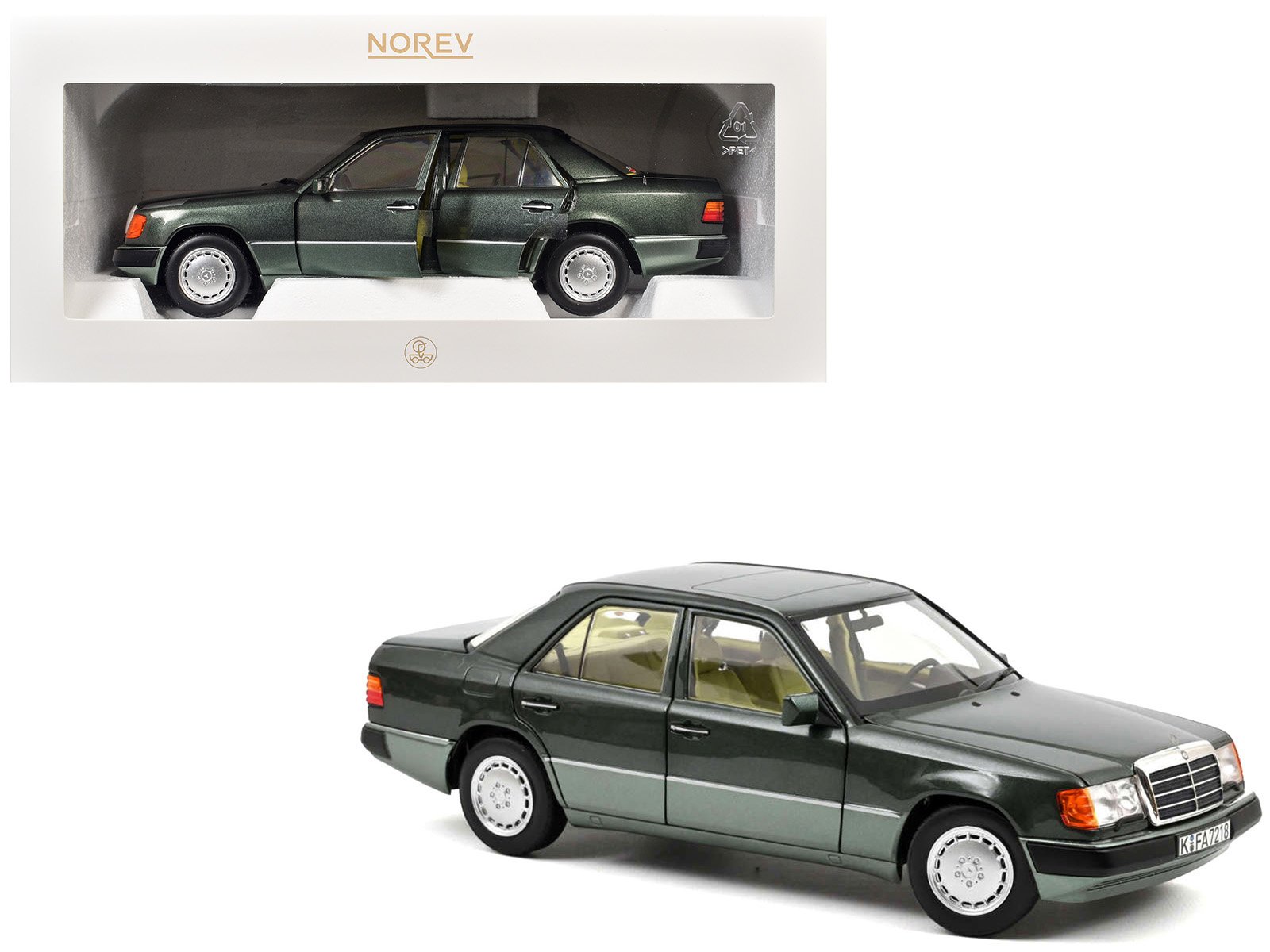 • Brand new 1/18 scale diecast car model of 1990 Mercedes-Benz 230 E Night Green Metallic with Green Interior die cast model car by Norev.