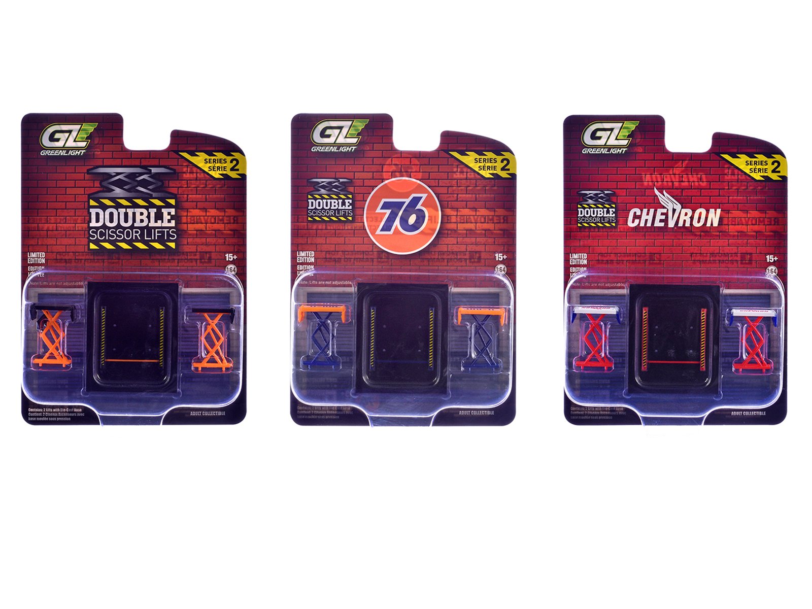 - Brand new 1/64 scale diecast models of Automotive “Double Scissor Lifts” Series #2 Set of 3 pieces die cast models by Greenlight.