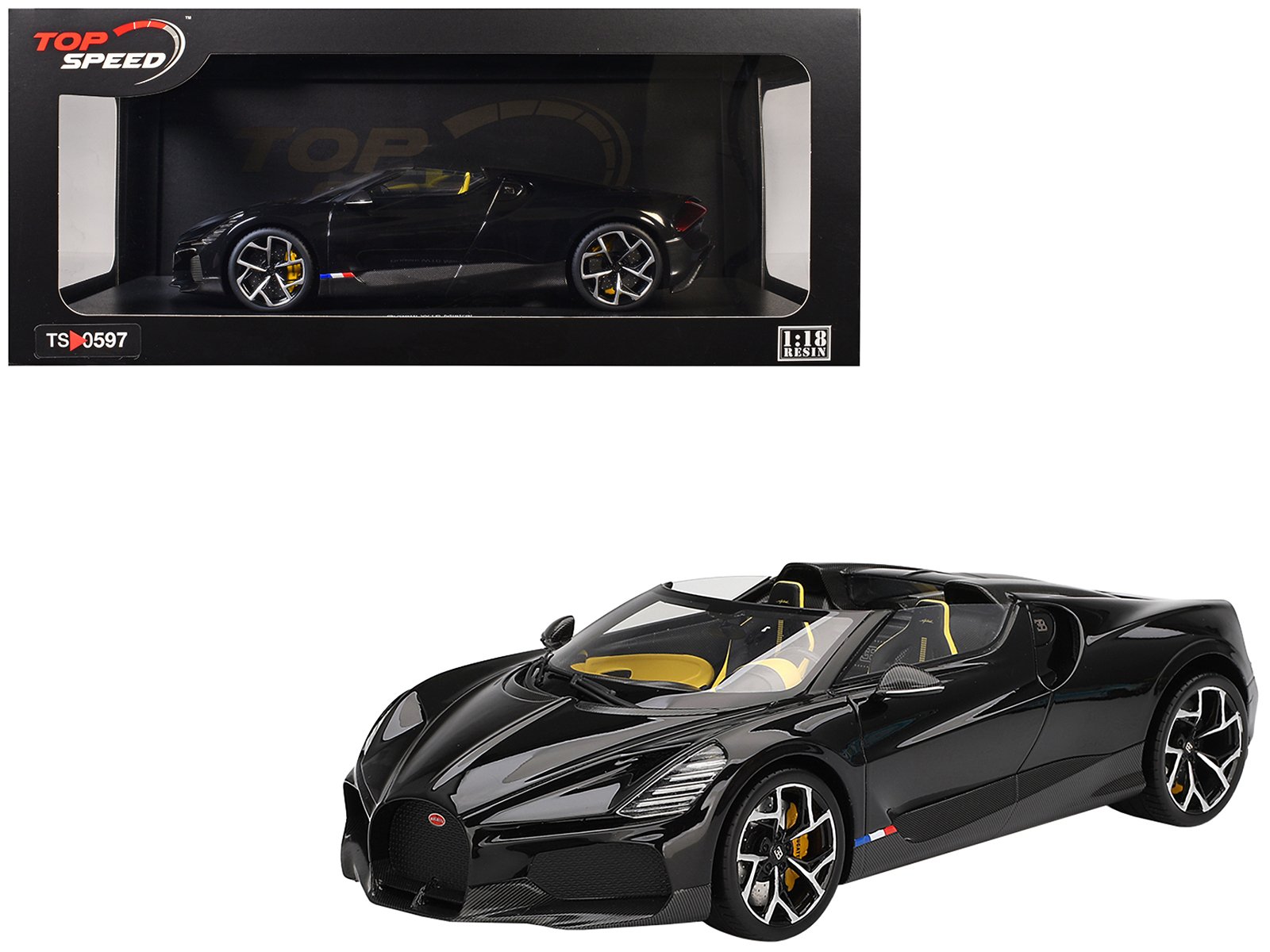 - Brand new 1/18 scale car model of Bugatti W16 Mistral Black with Yellow Interior model car by Top Speed.