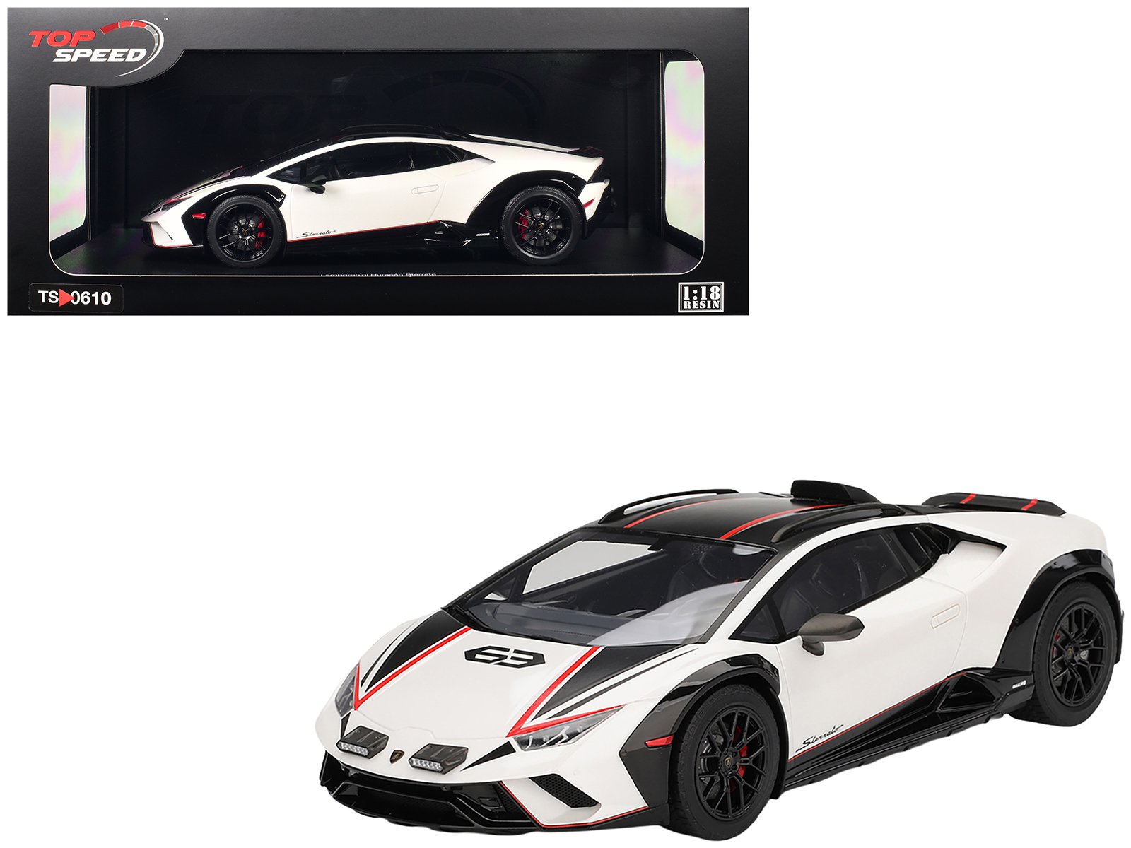- Brand new 1/18 scale car model of Lamborghini Huracan Sterrato Bianco Asopo White with Matt Black Top and Red Stripes model car by Top Speed.