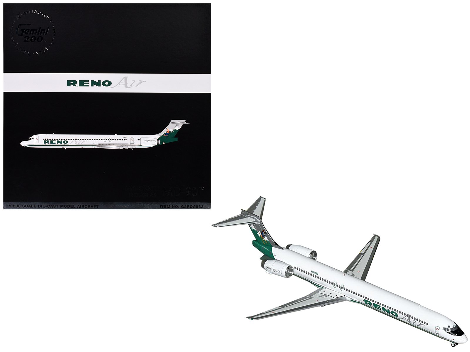 • Brand new 1/200 scale diecast airplane model of McDonnell Douglas MD-90 Commercial Aircraft “Reno Air” (N905RA) White with Green Tail “Gemini 200” Series die cast model by GeminiJets.