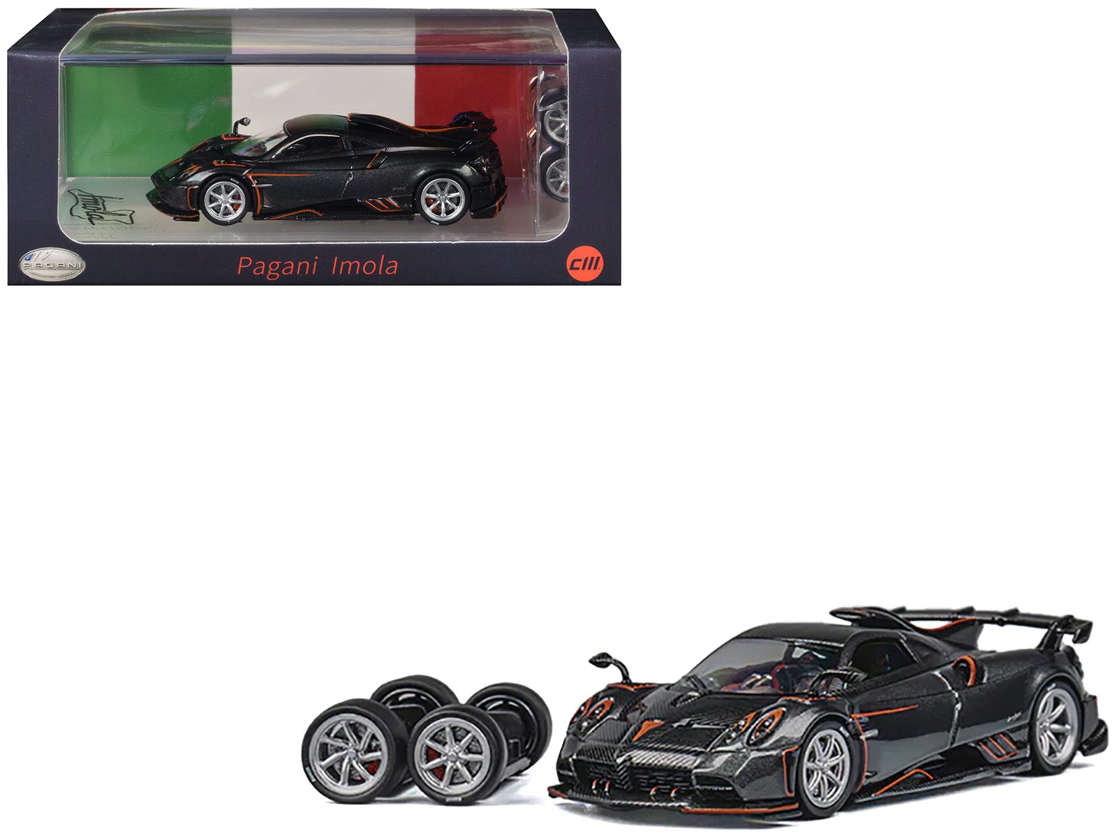 - Brand new 1/64 scale diecast car model of Pagani Imola Dark Gray Metallic with Carbon and Orange Accents with Extra Wheels die cast model car by CM Model.