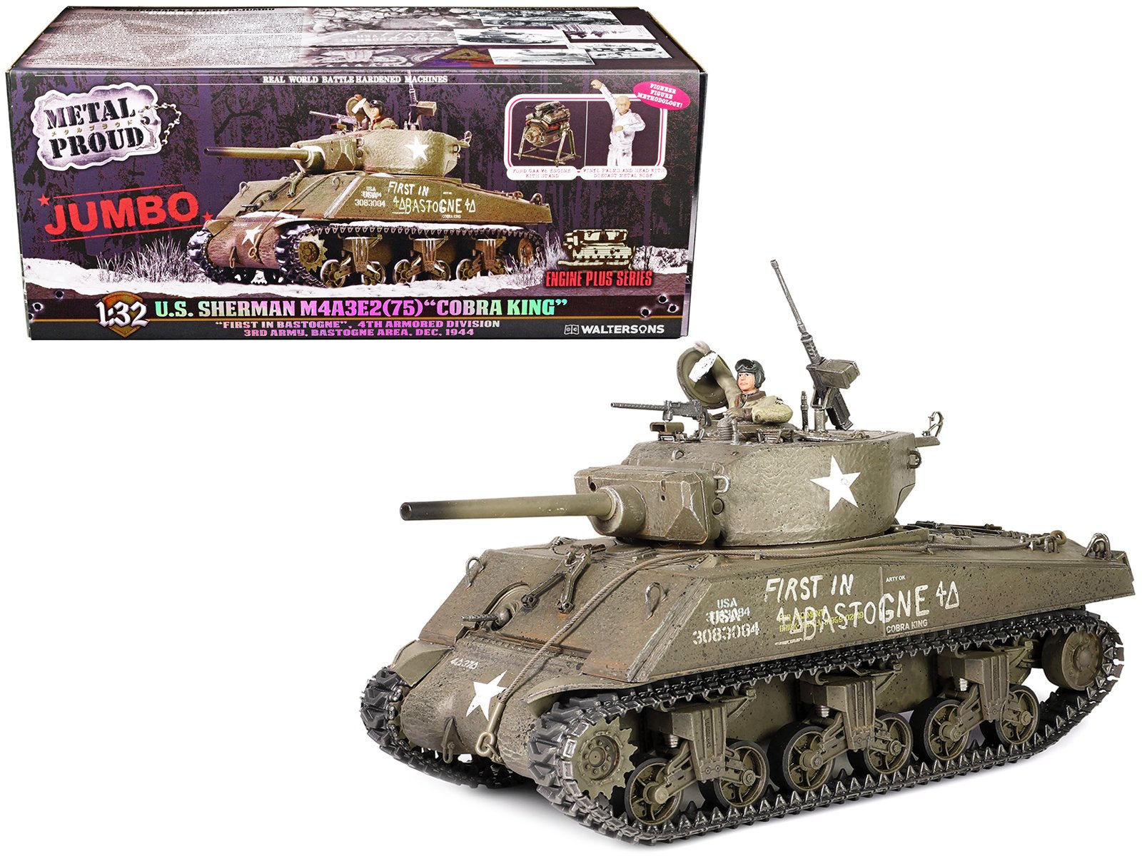 - Brand new 1/32 scale diecast model of Sherman M4A3E2 (75) “Cobra King” Medium Tank “First in Bastogne” George Smith Patton’s 4th A.Div. 3rd Army, Bastogne area (26 December 1944) “Engine Plus” Series die cast model by Metal Proud.